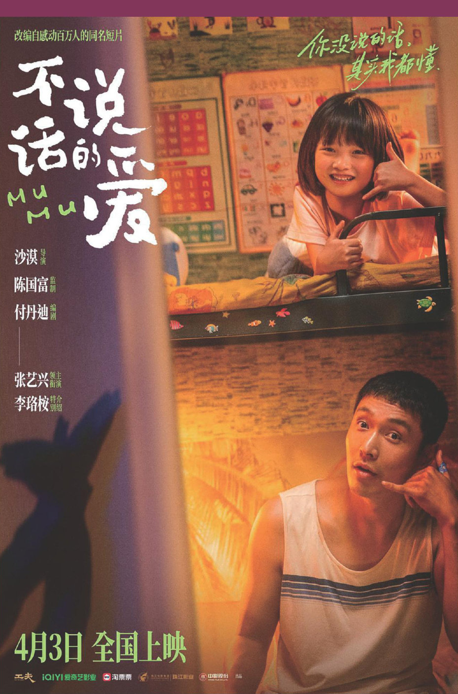 电影《不说话的爱》上映 电影《不说话的爱》由沙漠执导、陈国富监制,领衔主演张艺兴,特别介绍李珞桉,主演黄尧、安油,特别演出章若楠,友情出演袁文康、艾丽娅,特别邀请王先贺。电影改编自感动百万观众的同名催泪短片。 该片定档于2025年4月3日全面登陆河南奥斯卡院线。 剧情 听障爸爸小马(张艺兴饰)和女儿木木(李珞桉饰)彼此为伴,“小孩姐”木木是家里的“顶梁柱”,替爸爸和外界沟通,帮爸爸接活
