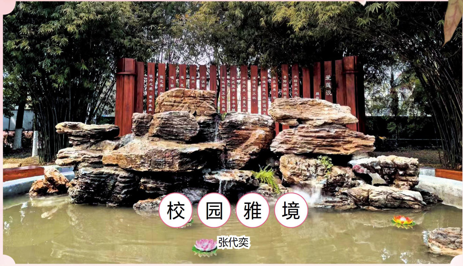 我们学校的教学楼与食堂之间,藏着一处雅致的景观。它以灵动的水景为中心,串联起长廊、竹林、花园与文化景观,既有中国传统园林的韵味,又贴合校园的实用需求,是师生休憩、赏景的绝佳去处。 这处景观的灵魂是一座圆形水池,直径约四米,池壁由浅灰色花岗岩砌成,线条简洁规整。池心矗立着一座近两米高的太湖石假山,十余块奇石错落堆叠,形态各异,石缝间形成两三处天然石洞,成为锦鲤嬉戏穿梭的秘境。池水为循环活水,从假山