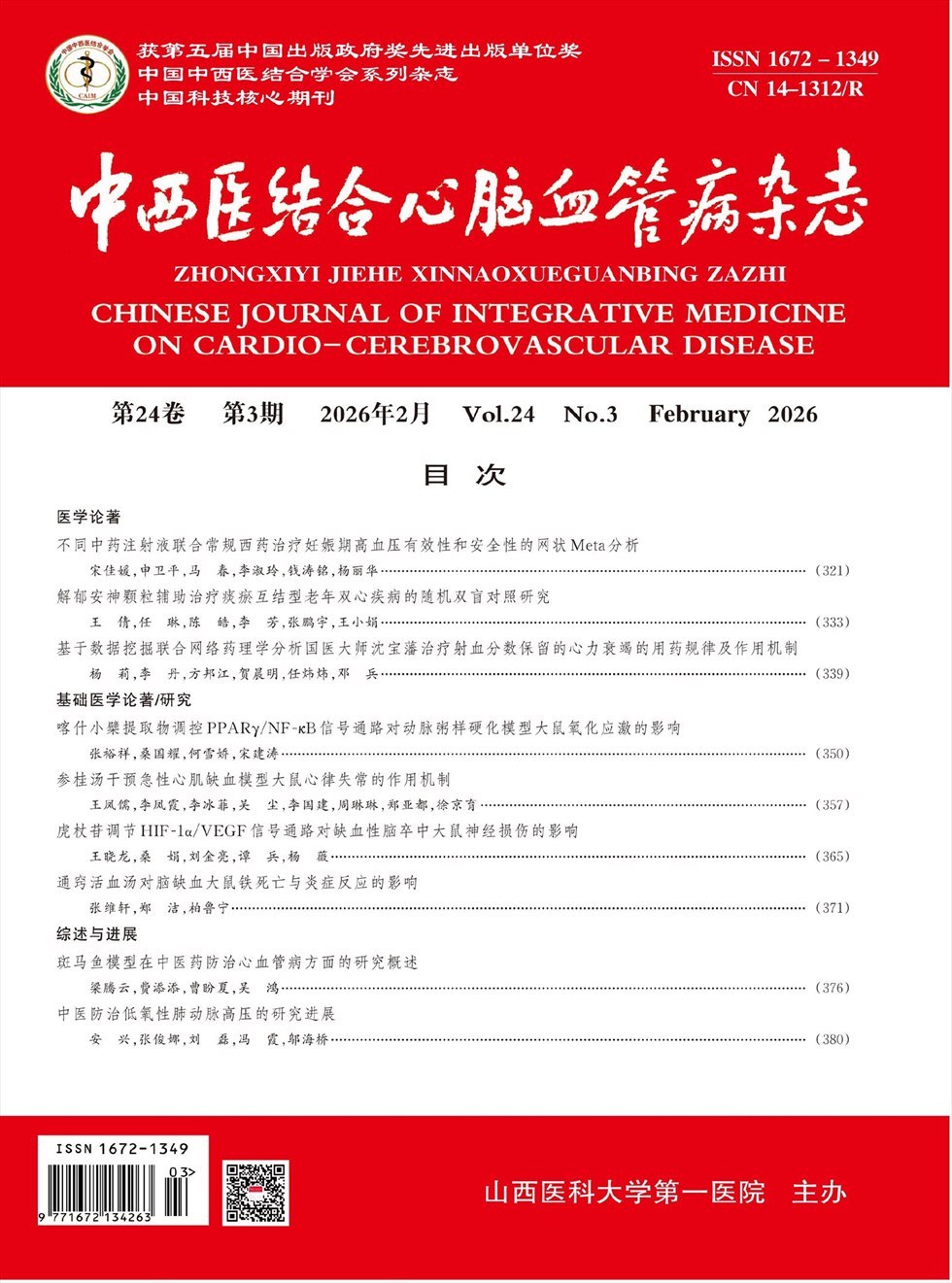 《中西医结合心脑血管病杂志》创刊于2003年1月,山西省卫生和计划生育委员会主管,山西医科大学第一医院与中国中西医结合学会心血管专业委员会和神经科专业委员会共同主办,中国科学院院士、中国中西医结合学会原会长陈可冀院士任名誉总编辑,中国中西医结合学会心血管病专业委员会主任委员吴宗贵教授任总编辑,是中西医结合学会、中华医学会心血管及神经科专业委员会知名专家任编委的国家级期刊,是国内唯一一种中西医结合心脑血管疾病学术刊物。