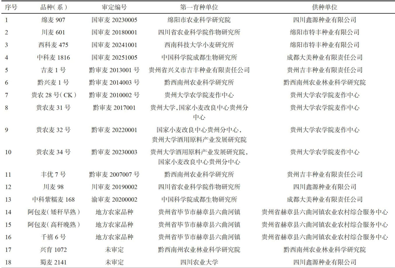 摘要:为筛选出适宜在金沙县生态区域内种植的优质、高产、抗病小麦品种,于2024年面向省内外征集了18个小麦品种(系)进行比较试验。结果表明:贵农麦31号、绵麦907、丰优7号、黔兴麦1号、贵农麦34号、吉麦1号小麦品种具有较强的适应性,抗逆性好,生育期适宜,综合性状表现较好,每 667m2 产量可达 350.9~401.7kg ,较对照贵农28号增产 18.6-69.4kg ,增幅为 5.60%~20.88% ,可在金沙县小麦种植区域小面积推广,阿包麦(高秆晚熟)阿包麦(矮秆早熟)千禧6号建议种植在灾害风险较低的区域或者与高抗病品种(如抗条锈病品种)混播,降低整体病害风险,其余品种(系)需继续引种试验。