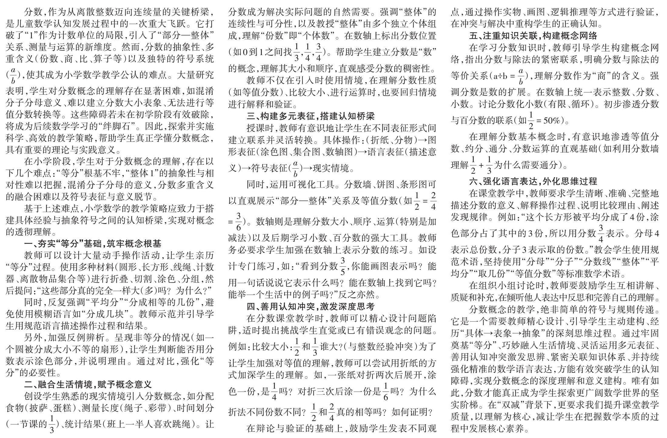 分数,作为从离散整数迈向连续量的关键桥梁,是儿童数学认知发展过程中的一次重大飞跃。它打破了“1”作为计数单位的局限,引入了“部分—整体”关系、测量与运算的新维度。然而,分数的抽象性、多重含义(份数、商、比、算子等)以及独特的符号系统([ab]),使其成为小学数学教学公认的难点。大量研究表明,学生对分数概念的理解存在显著困难,如混淆分子分母意义、难以建立分数大小表象、无法进行等值分数转换等。这些障碍