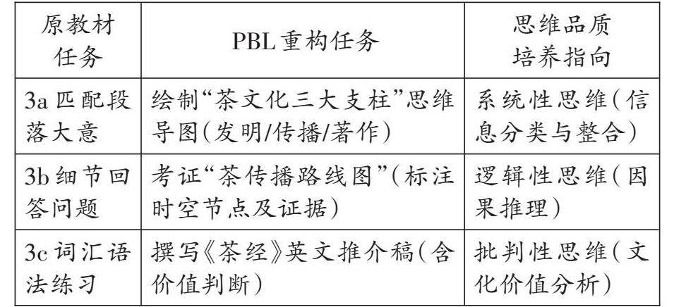 摘要:思维品质作为英语学科核心素养的关键维度,涵盖逻辑性、批判性与创造性等核心能力。本文以人教版八年级Unit 6 Section A 3a-3c “An Accidental Invention”(茶叶的偶然发明)阅读课为实践载体,依托项目式学习(PBL)“真实性探究”理论框架,设计“茶文化国际推广”主题项目。通过构建“问题驱动—探究实践—成果创生”三阶教学模式,将传统阅读环节重构为项目任务链,
