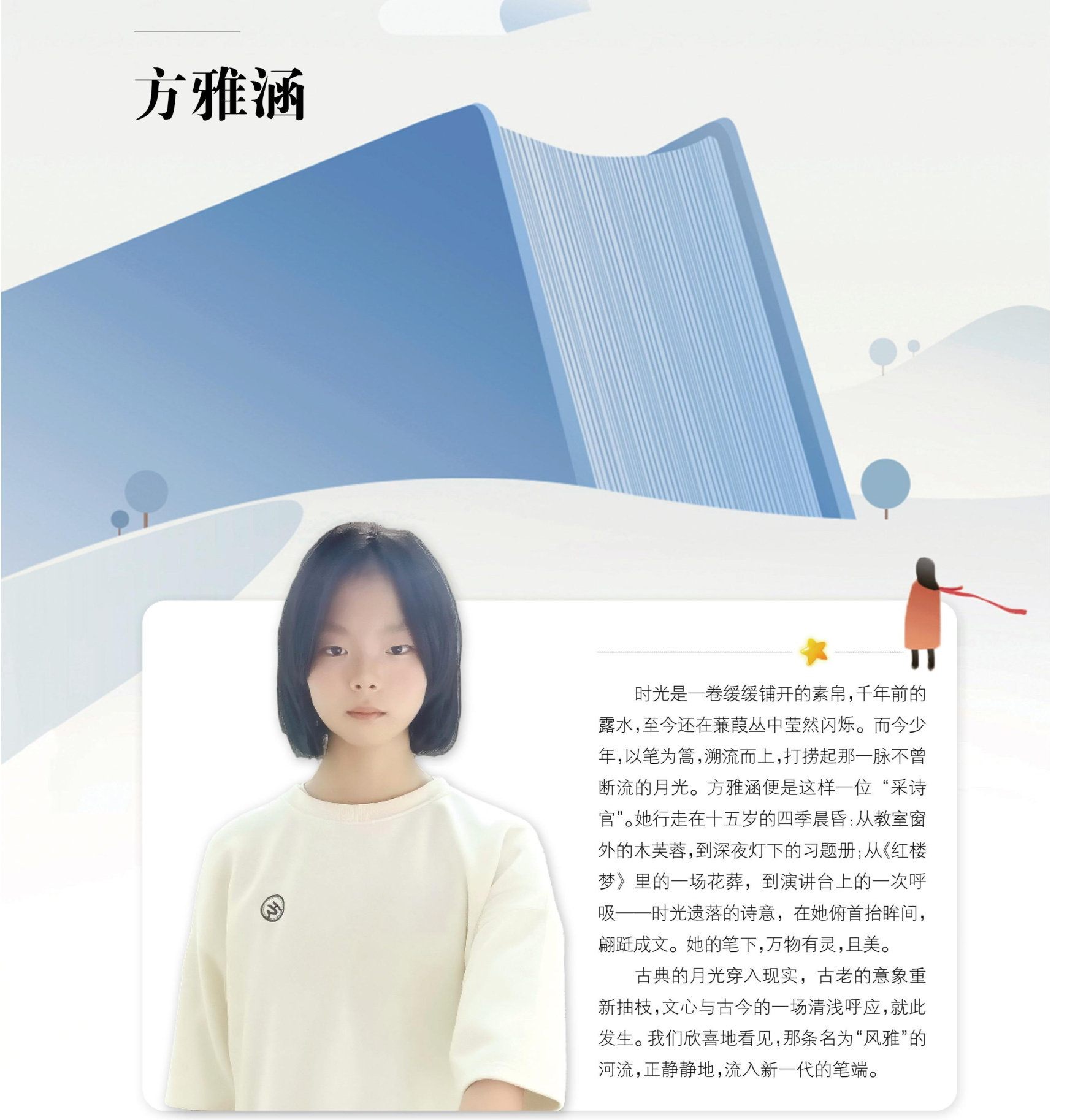 时光是一卷缓缓铺开的素帛,千年前的露水,至今还在蒹葭丛中莹然闪烁。而今少年,以笔为篙,溯流而上,打捞起那一脉不曾断流的月光。方雅涵便是这样一位“采诗官”。她行走在十五岁的四季晨昏:从教室窗外的木芙蓉,到深夜灯下的习题册;从《红楼梦》里的一场花葬,到演讲台上的一次呼吸——时光遗落的诗意,在她俯首抬眸间,翩跹成文。她的笔下,万物有灵,且美。 古典的月光穿入现实,古老的意象重新抽枝,文心与古今的一