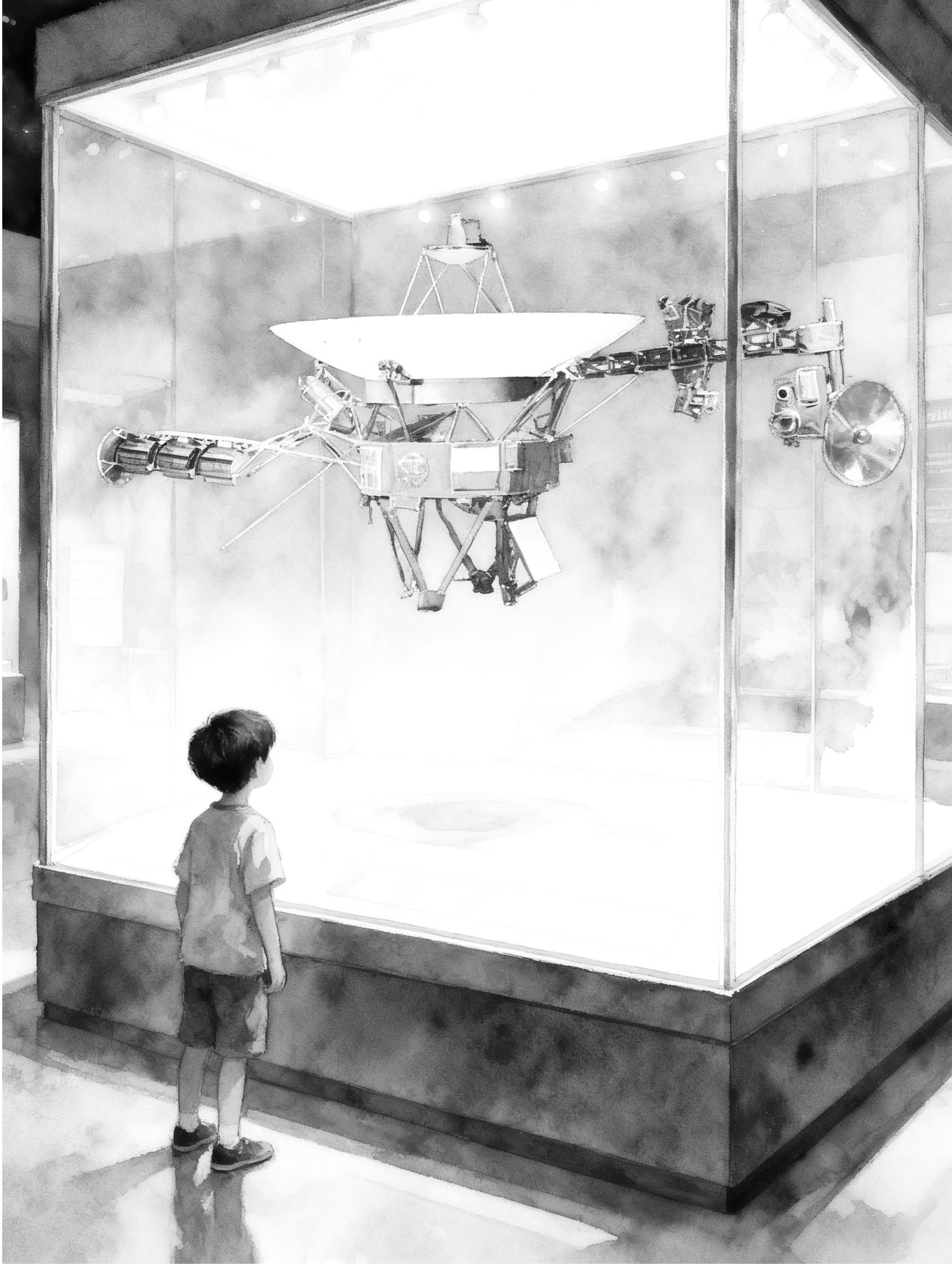 一 博物馆的灯光有些暗,让人心有余悸又浮想联翩。四周静悄悄的,我能清晰地听到自己的脚步声和心跳。 “小宇,快看!这就是‘旅行者一号’!” “真的?旅行者!”虽然已经预知了参观内容,但此时此刻,站在博物馆银河系真实比例模拟展柜面前,我心里还是咯噔了一下。 我揉了揉眼睛,凑近玻璃展柜。柔和的灯光下,一个银白色的探测器模型静静地悬浮着,它的主体像个巨大的卫星天线,旁边伸出一根长长的机械臂
