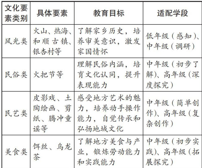 【摘要】“双减”政策要求教师提高作业质量,同时减少作业数量。在这样的背景下,跨学科实践作业因具有整合性、实践性、素养导向等特征,成为许多教师研究和尝试的新方向。将地域文化融入跨学科实践作业,既会让作业更富有趣味和现实意义,又会让作业具有地方特色,能够增强学生的文化认同感。文章围绕腾越第二完全小学设计的融入云南腾冲文化的跨学科实践作业,分析如何按照“筛选文化要素—设计分学段作业一实践验证—优化完善”的路径,遵循内容真实、学科融合、学生主体、安全可行等原则设计作业。