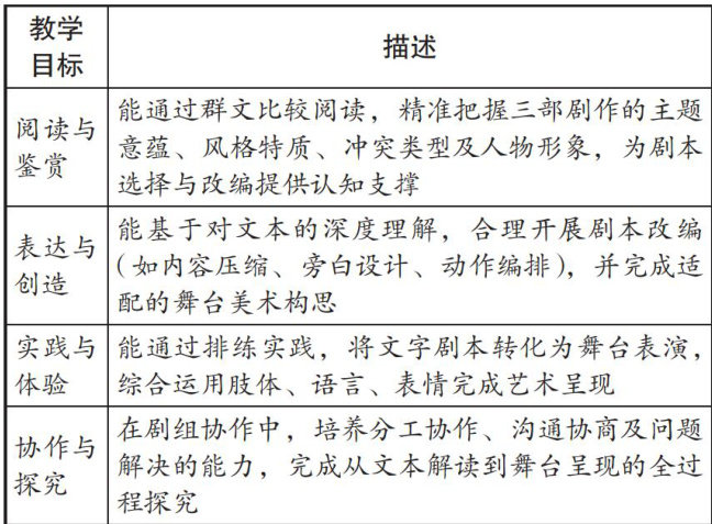 【摘要】在传统教学模式下,初中语文戏剧“活动·探究”单元教学易出现形态单篇化、重心文本化、活动与探究割裂化、评价单一化等问题。文章以统编版初中语文九年级下册戏剧单元为例,探讨基于大单元教学理念的教学策略:以“演出我的理解”为核心目标统领逆向设计,依托剧组化情境创设真实学习场域,构建“阅读·改编·排练·展演”一体化任务链,采用贯穿学习全程的表现性评价方式,旨在为相关教学实践提供参考。