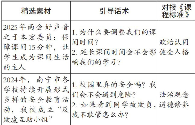 【摘要】文章聚焦于小学高段(五、六年级)的道德与法治教学,依据《课程标准》探索时政新闻融入常态化教学的实践模式。该模式以“每周10分钟时政分享”活动为核心,构建“一平台两模式”的实践体系,旨在推动小课堂与大社会深度融合,助力学生政治认同、道德修养、法治观念、健全人格等核心素养的落地。