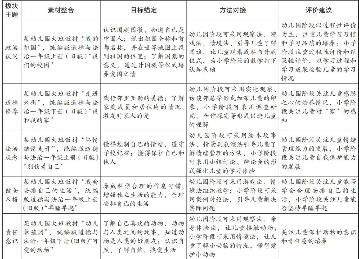 【摘要】文章结合幼儿园和小学区域环境、教学特点、教材内容、学习方式以及体系结构,从不同维度破解幼小衔接问题,并探索“目标锚定一过程衔接—评价融育”的幼小协同视角下道德与法治课程衔接路径,以期激活幼小协同育人新样态。