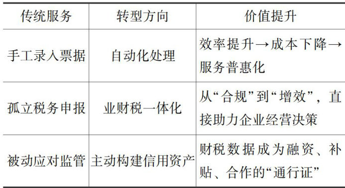 摘要:随着金税工程的深化与中小企业高质量发展需求的升级,财税服务行业正经历从基础核算向价值赋能的转型。中小企业财税需求呈现出“生存型保合规”“过渡型优税负”“发展型重资源”的差异化特征,推动服务商构建阶梯式产品体系,分阶段推进数字化能力建设,最终实现财税服务的生态化转型;财税服务商应通过差异化竞争策略,实现从劳动密集型向资源整合型的跃迁,最终成为中小企业全生命周期发展的战略伙伴。