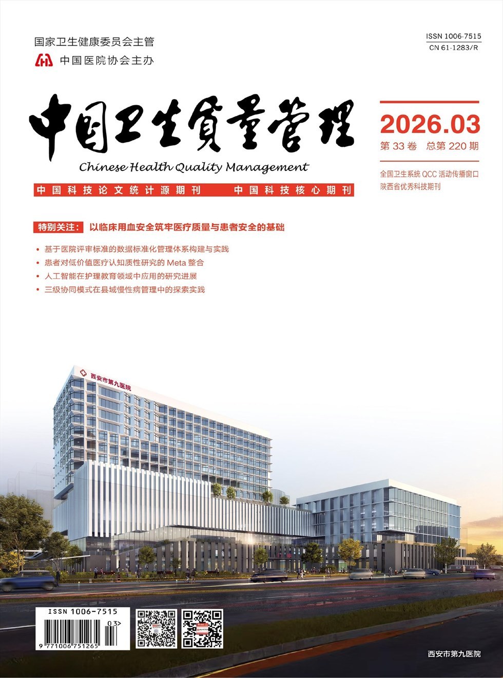 《中国卫生质量管理》杂志是由中华人民共和国国家卫生健康委员会主管,中国医院协会及陕西省人民医院主办的卫生质量管理期刊。《中国卫生质量管理》杂志是我国为以研究和交流卫生质量领域方法及学术成果的全国性指导类科技期刊。是“中国科技论文统计源期刊(中国科技核心期刊)”。 2010年荣获“陕西省优秀科技期刊”