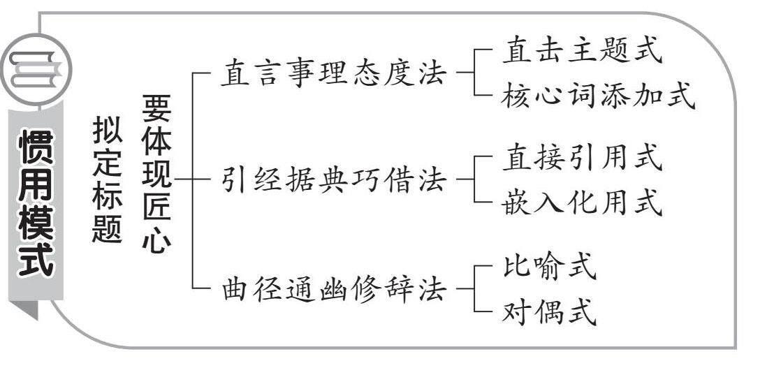 道点简释 郑板桥说:“题高则诗高,题矮则诗矮,不可不慎也。”文亦如此,议论文尤其如此。标题是一篇文章的“龙睛”,一个好的标题,或淬炼观点,或凝练思想,或精妙警世,或才藻艳逸。标题不仅可见文章匠心、构思,也可见作者的胸襟、才思。总之,“题好一半文”。 想要拟好议论文题目,首要的是根据材料分析其中蕴含之理,提炼出关键词,再用以下几种方法拟写题目。 【学仿有例一】 直言事理态度法 直言事理就是