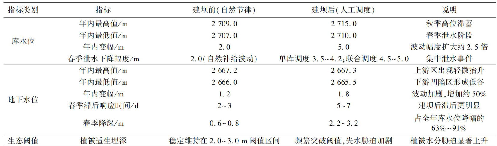摘要:为评估羊曲水电站运行对区域水文过程与湿地生态系统的影响,基于2015—2022年水位监测数据,采用MODF-LOW模型,对比分析建坝前、后区域水文变化过程,重点揭示地下水位波动机制及其生态响应。结果表明: ① 水库运行显著扰动自然水文节律,库水位年内变幅由 2.0m 扩大至 5.0m ,春季泄水时库水位下降达 3.5~5.0m ,秋季高位滞蓄至2715.0m ② 地下水位年内变幅由 1.2m 增至 1.8m ,春季调蓄阶段出现5\~7d滞后,降深达 2.2~3.2m ,频繁突破湿地植被适生埋深阈值 2.0~3.0m ③ 地下水位空间格局由对称连续格局转为非对称分段格局,上游近坝区抬升 0.14m ,下游主影响带下降 0.10m ,横向水力连通性减弱; ④ 生态适宜性表现为地下水埋深 2.0~<3.5m 区间最优,湿地此区间面积占 40% ,埋深 <1.0m 或 ?6.0m 区间植被生长受限,湿地此区间面积各占 10% ⑤ 水库运行可通过“水库调度-地下水响应-生态胁迫”机制进行生态调度,调度时应以维持 2.0~<3.5m 适宜地下水埋深为核心,控制春季日泄水降幅( (?1.0 m),并推行分段缓升调度策略,实现开发与保护的协调发展。
