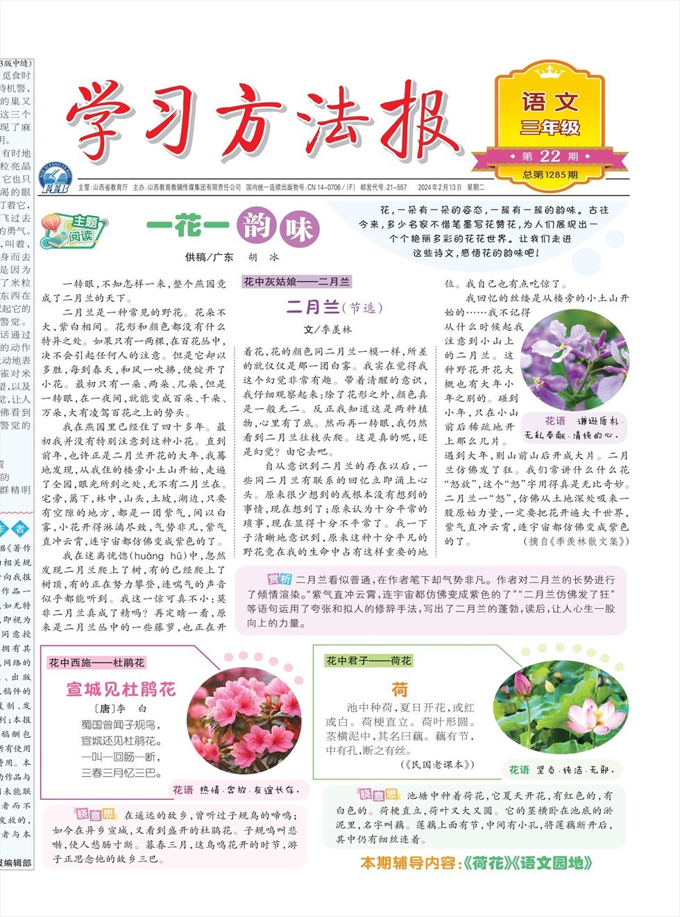 花,一朵有一朵的姿态,一簇有一簇的韵味。古往今来,多少名家不惜笔墨写花赞花,为人们展现出一个个艳丽多彩的花花世界。让我们走进这些诗文,感悟花的韵味吧! 一转眼,不知怎样一来,整个燕园竟成了二月兰的天下。 二月兰是一种常见的野花。花朵不大,紫白相间。花形和颜色都没有什么特异之处。如果只有一两棵,在百花丛中,决不会引起任何人的注意。但是它却以多胜,每到春天,和风一吹拂,便绽开了小花。最初只有一朵、