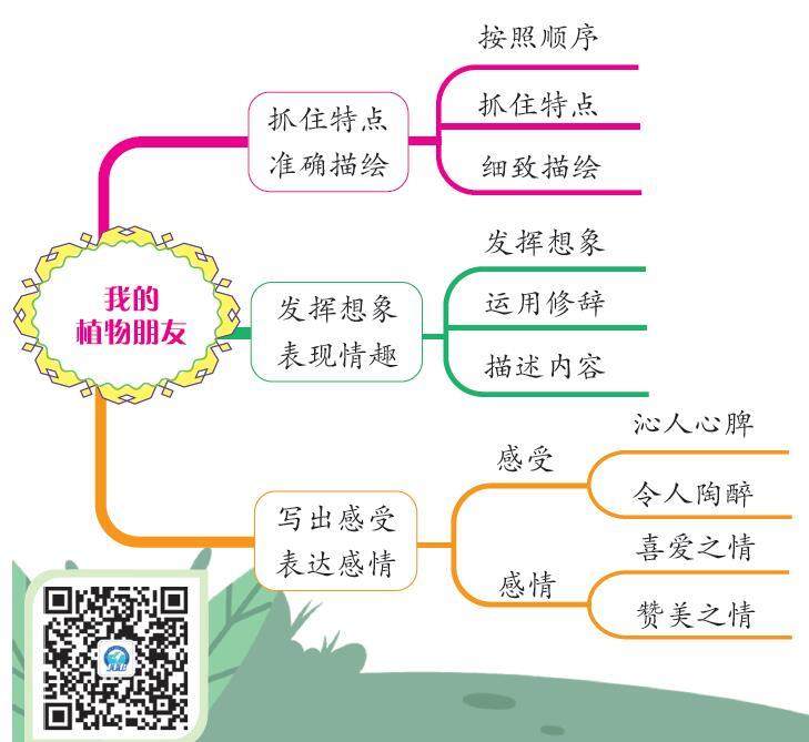 春天到了,小草从泥土里探出脑袋,柳枝冒出嫩绿的新芽,粉红的桃花在枝头绽放……到处都是一派生机勃勃的景象。那么,怎样才能写好植物朋友呢?朱老师来教教你。 一、抓住特点,准确描绘。每种植物都有其特点,我们必须在仔细观察的基础上,按照一定的顺序将其与众不同的地方细致地描绘出来。比如,《荷花》一课中,作者把荷花的不同姿态,用“有的……有的……有的……”这样的句式生动地描绘了出来。 二、发挥想象,表现情
