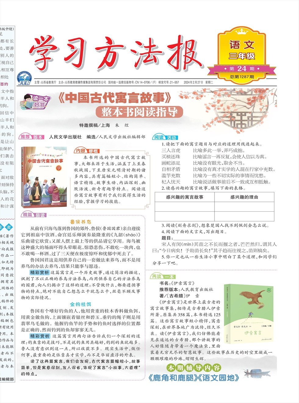 [推荐][版本] 人民文学出版社 编选/人民文学出版社编辑部 [内容][梗概] 本书所选的中国古代寓言故事,大都来源于生活,涵盖了上至春秋战国,下至唐宋元明清时期的诸多内容,具有篇幅短小、结构简单、语言精练、故事生动、内涵深刻、幽默活泼、新奇有趣等特点。阅读这些寓言故事有利于我们获得生活的经验,掌握学习的技能。 [精篇][品读] 鲁侯养鸟 从前有只海鸟落到鲁国的郊外,鲁侯(鲁国国