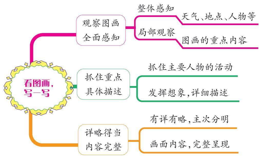 亲爱的同学,今天我们要看放风筝图写故事啦!除了要仔细观察图画,我们还要发挥想象,这样写的故事才能精彩。画面是场景的“一瞬间”,是静止的,我们要让画面“动”起来。老师来告诉你几个金点子。 金点子一:观察图画,全面感知。图画展示的是放风筝的活动场面。在这个活动中,许多事情是同时发生的,所以我们在描写之前,要全面、细致地观察。我们既要整体感知:图画上是什么天气,什么地方,有哪些人;又要局部观察:图画上