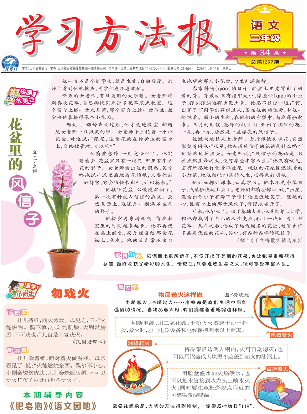 原文读 杜儿持纸,向火为戏。母见之,曰:“火能燃物。偶不慎,小则灼肌肤,大则焚房屋,不可戏也。”儿自是不复戏火。 ——《民国老课本》 其意晓 杜儿拿着纸,面对着火做游戏。母亲看见了,说:“火能燃烧东西。偶尔不小心,小则会烫伤皮肤,大则会烧毁房屋,不可以玩火!”孩子从此再也不玩火了。 懂安全 物品着火这样做 电器着火,油锅起火……这些都是我们生活中可能遇到的情况。当物品着火时,我们提醒