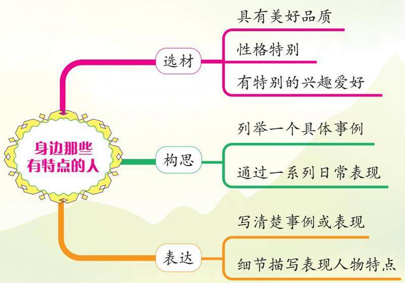 习作指导 怎样才能把我们身边最有特点的人写好呢?老师教大家几个妙招。 妙招一:选材——聚焦人物特点。 首先要确定写作对象,哪个人物给你的印象最深刻?是你的亲人、同学、朋友,还是邻居?我们要从这些人中选择具有鲜明特点的人,作为写作对象。比如:热心肠、乐天派、智多星、昆虫迷。这些人物或是品质美好,或是性格特别,或是有特殊的兴趣爱好。 妙招二:构思——列举典型事例。 要想表现人物的特点,必须用