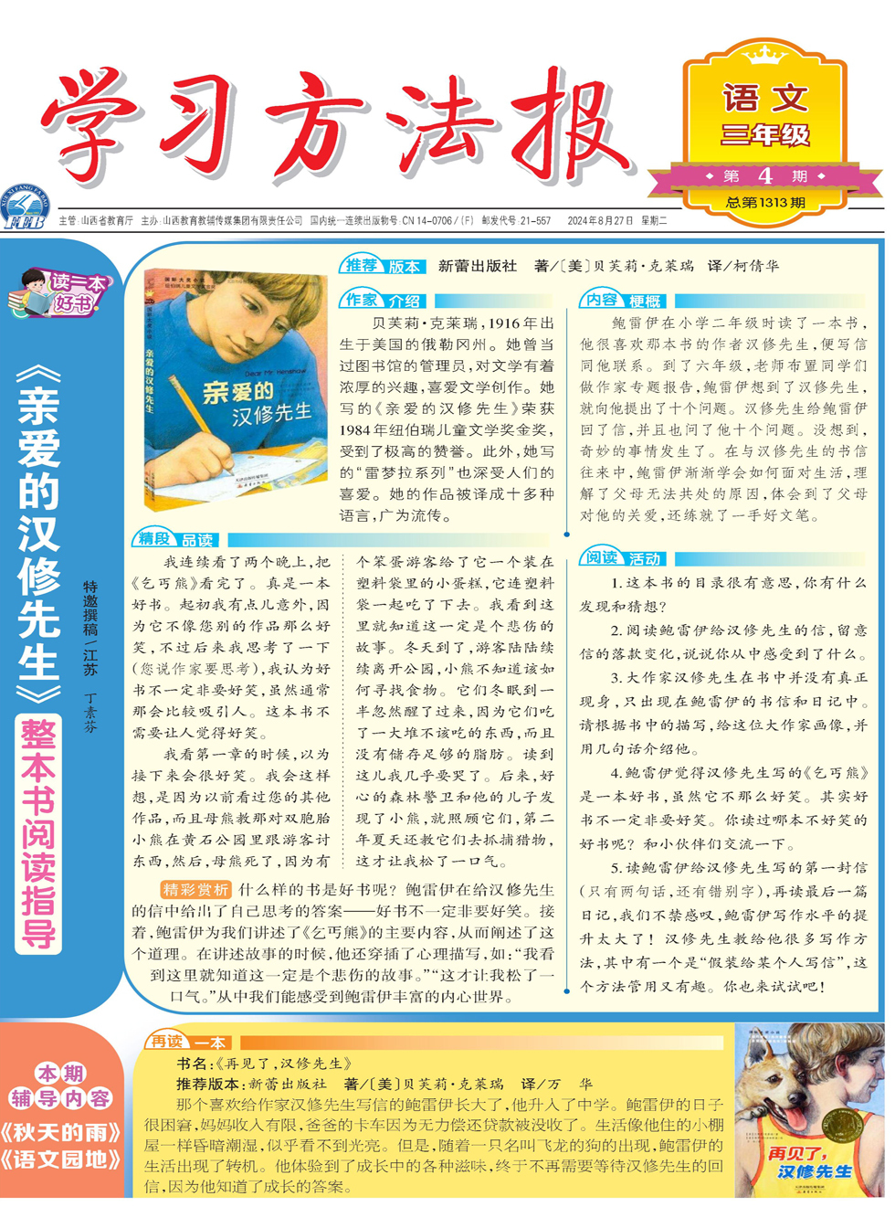 [推荐][版本] 新蕾出版社 著/〔美〕贝芙莉·克莱瑞 译/柯倩华 [作家][介绍] 贝芙莉·克莱瑞,1916年出生于美国的俄勒冈州。她曾当过图书馆的管理员,对文学有着浓厚的兴趣,喜爱文学创作。她写的《亲爱的汉修先生》荣获1984年纽伯瑞儿童文学奖金奖,受到了极高的赞誉。此外,她写的“雷梦拉系列”也深受人们的喜爱。她的作品被译成十多种语言,广为流传。 [内容][梗概]