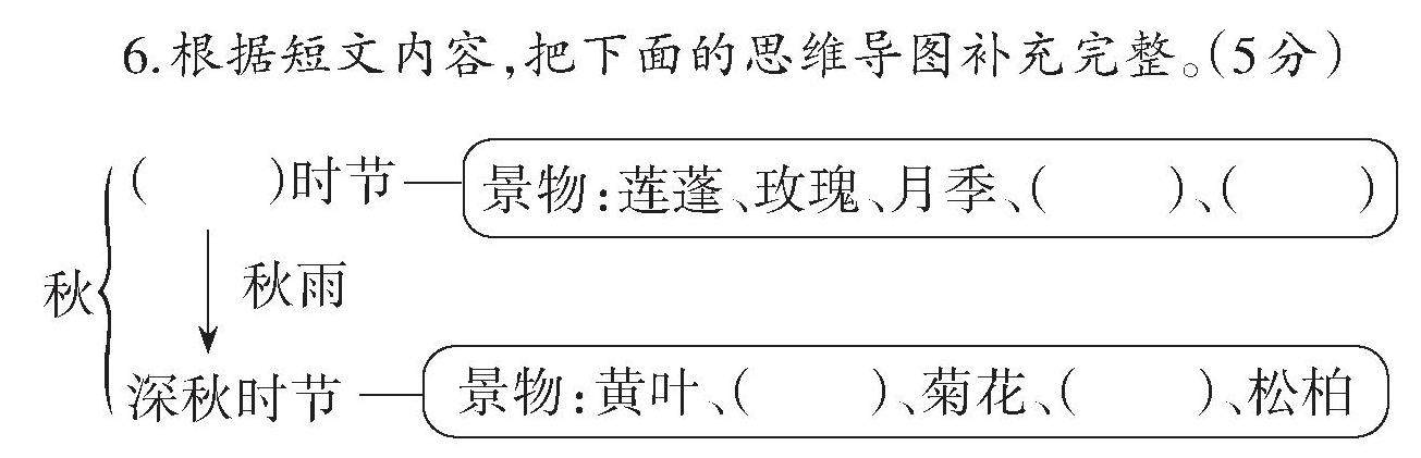秋天到了,大自然换上了五彩的盛装,丰收的喜悦洋溢在每一个角落。秋天,是一首精彩的诗篇,是一幅美丽的画卷,让我们一起完成下面的任务,去品味秋吧! 任务一:夯实基础·感受秋天的韵味。(50分) 1.读拼音,写词语。(14分) 红红的枫叶像一枚枚yóu piào( ),送来了秋天的凉爽。yuàn qiáng( )外的shuǐ ní( )道上,pū mǎn( )了jīn huáng(