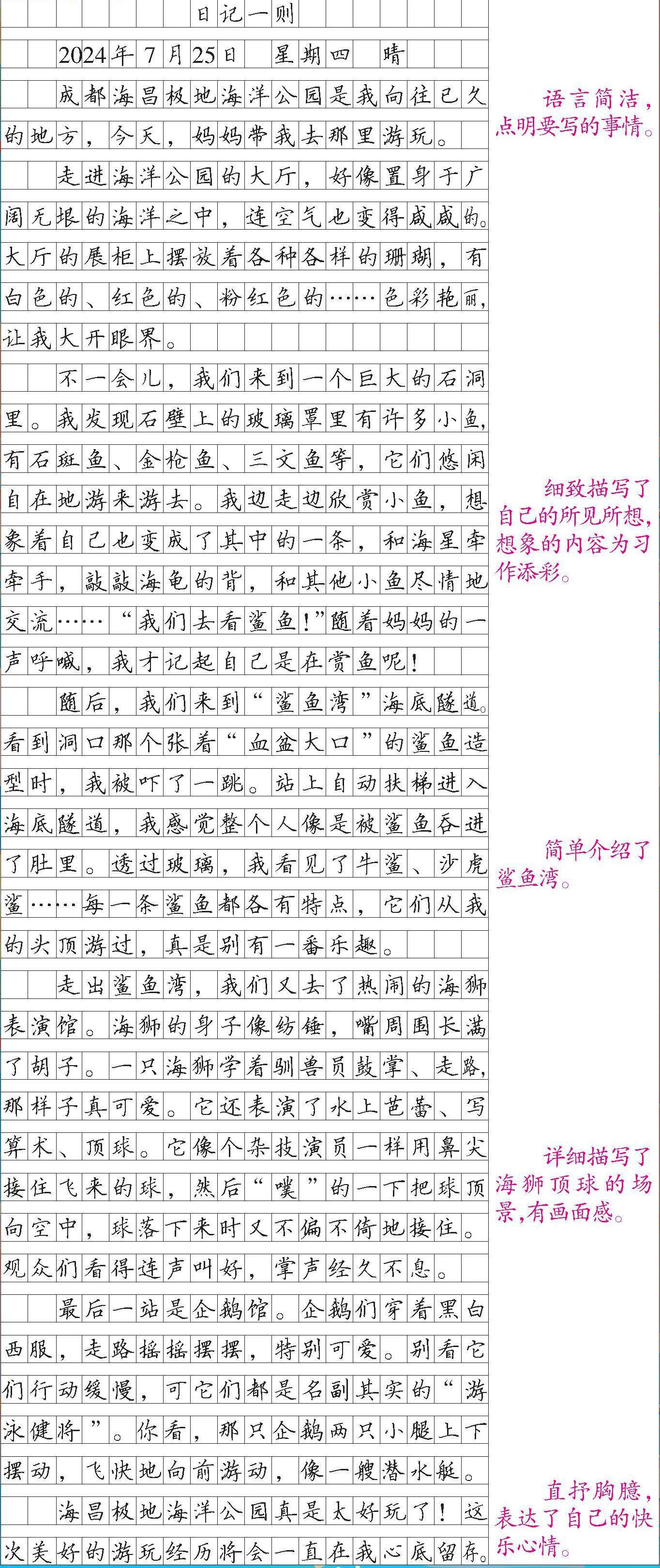 2024年7月25日 星期四 晴 成都海昌极地海洋公园是我向往已久的地方,今天,妈妈带我去那里游玩。 走进海洋公园的大厅,好像置身于广阔无垠的海洋之中,连空气也变得咸咸的。 大厅的展柜上摆放着各种各样的珊瑚,有白色的、红色的、粉红色的……色彩艳丽, 让我大开眼界。 不一会儿,我们来到一个巨大的石洞里。我发现石壁上的玻璃罩里有许多小鱼, 有石斑鱼、金枪鱼、三文鱼等,它们悠闲自在地游来游去