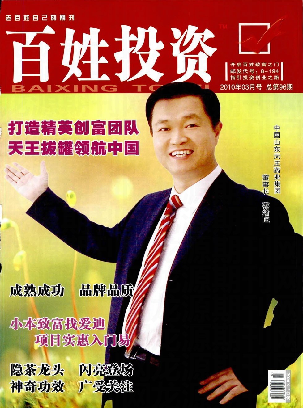 一位来自鸢都潍坊的生物医药专家又一次登上了人民大会堂的领奖台,与“神州六号”航天英雄费俊龙、聂海胜,阿里巴巴创办人、首席执行官马云等一同入围了“中国十大影响力人物”,当他从全国人大副委员长万国权、许嘉璐手中接过奖杯和证书时,与会的数十家媒体及数百名代表立刻抱以热烈的掌声,表达了对蔡绪旺和他所创立的天王集团对中国医疗保健事业所做贡献的充分肯定。数百名新闻记者拍下了这激动人心的场面。这是他继与