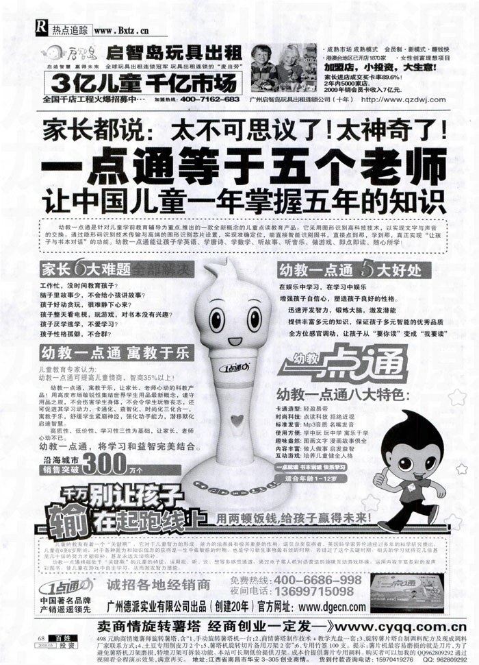 巧博士《一元按摩店》,您听说过只花一块钱就能享受这样的按摩吗?您知道投资几千元就能开一家这样的店吗? 现在机会来了,开一家巧博士《一元按摩店》,享受真正的投资低、高回报的经营项目。开店五年多就已拥有1000多家分店。店店火爆,家家赚钱,确保加盟一家,成功一家。本店采用专利产品,能模拟人手的按摩器进行穴位按摩,对头部、颈椎、肩周、腰部、腿部、足底进行点压、推拿、揉捏并能自动追逐穴位按摩