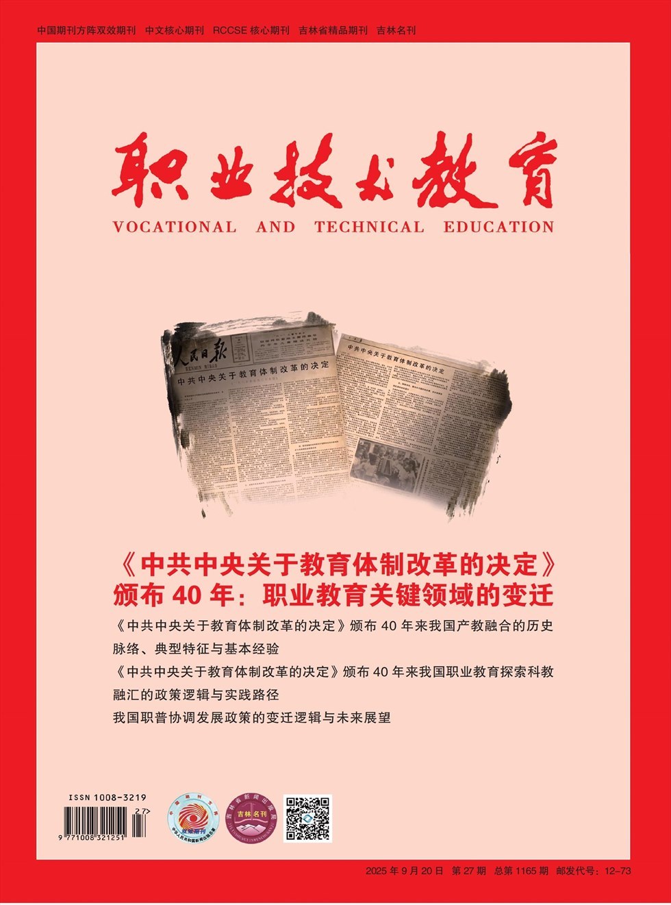 《职业技术教育》创刊于1980年,是新中国成立后创办的第一本公开出版的职教专业期刊,是中国职教学会期刊委员单位,被新闻出版署评为中国期刊方阵“双效期刊”,是吉林省精品期刊,中文核心期刊,RCCSE核心期刊。