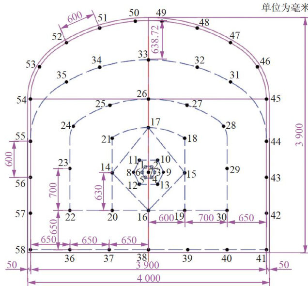 摘要:针对某破碎地下金属矿山进路式采矿中存在的断面成形质量差、超欠挖严重、炮孔利用率低及炸药单耗偏高等问题,在调研工程地质条件和既有爆破工艺的基础上,对掏槽方式、炮孔布置、炮孔深度、装药结构及起爆网络等关键爆破参数开展了现场试验与对比分析,提出了双阶同深分次掏槽技术与导爆管雷管接力式簇联起爆网络相结合的优化方案。通过减小周边孔间距、采用不耦合装药与光面爆破技术,有效控制了围岩损伤和巷道超欠挖,并在保证安全条件下实现了单循环较大进尺。应用结果表明:爆破参数优化后,整体炸药单耗由 2.93kg/m3 降至 1.876kg/m3 下降 35.9% ;总装药量下降 42.5% ;炮孔利用率由 82.1% 提高到 95.0% ,整体提升 15.7% ;日循环进尺提高 5.5% ,半壁孔痕率稳定在 76% 以上,断面超欠挖量控制在 10cm 以内。研究成果为类似地质条件下地下金属矿山进路式采矿的爆破参数设计与现场控制提供了可借鉴的工程实例和技术依据。