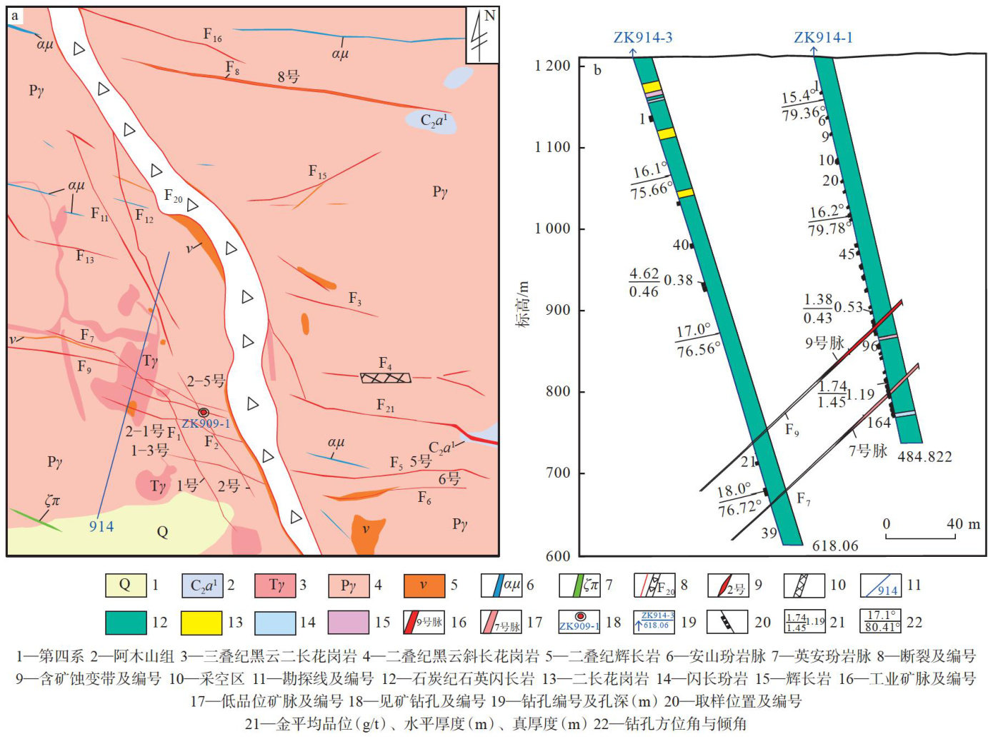 摘要:陶勒盖金矿床为内蒙古乌拉特后旗新近发现的一处大型石英脉-蚀变岩型金矿床,矿体产于石炭纪石英闪长岩中,受北西西向及北北西向2组断裂控制。矿区热液成矿作用划分为4个成矿阶段:浸染状黄铁矿-石英阶段(I)、石英-黄铁矿( ± 方铅矿 ± 黄铜矿)阶段(Ⅱ)、石英( ± 黄铜矿 ± 黄铁矿)-方铅矿-闪锌矿阶段(Ⅲ)、石英-方解石阶段(IV)。矿区金成矿作用与二叠纪黑云斜长花岗岩关系密切,矿床成因属于中温岩浆热液型矿床。重点利用3DMine 软件对矿区北西西向7号及9号矿脉进行三维空间建模,结果表明:7号矿脉矿化较好部位主要集中于23号勘探线—15号勘探线与7号勘探线—0号勘探线,矿化呈现出水平方向上西向中等角度侧伏、垂向上分段富集规律;9号矿脉矿化较好部位位于11号勘探线—3号勘探线与15号勘探线—4号勘探线,矿化富集亦呈现出水平方向上西向中等角度侧伏、垂向上分段富集规律,均受成矿期北西西向控矿断裂右行逆冲运动方式控制。依据上述规律,圈定了可供7号及9号矿脉进一步探矿的深部找矿靶区6处。