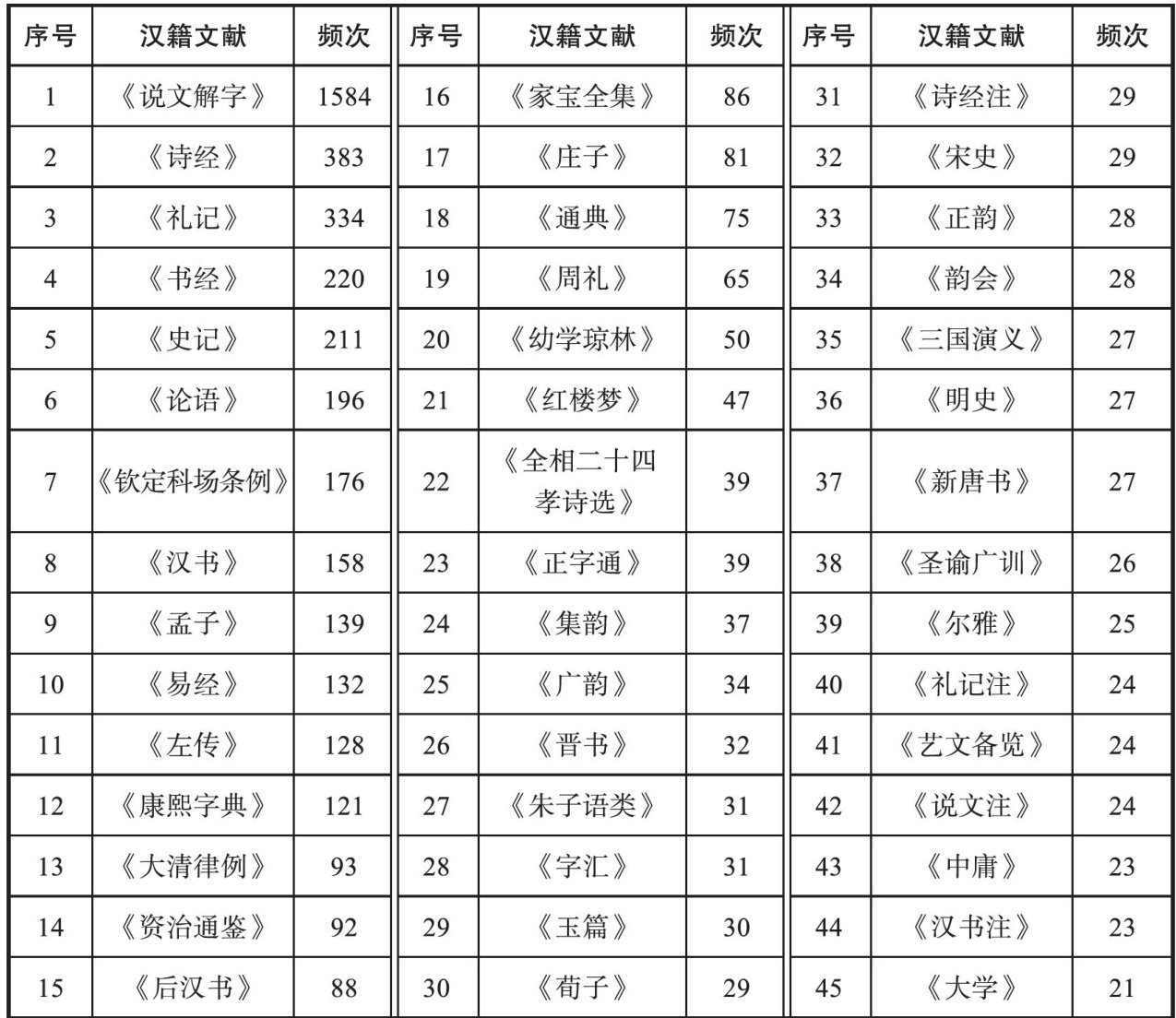 摘要《华英字典》是世界上首部汉英词典,其配例引述了大量汉籍文献。经考据可知,《华英字典》共收录6648条引证,出自569种汉籍文献,涵盖思想、宗教、文学、历史、法律、军事、语言文字、地理、教育、科技、政治和其他百科类12类主题。各类文献的分布不均衡,仅语言文字、法律和思想类文献的平均被引频次相对较高,是马礼逊关注的重点。语言文化为主兼具百科性,引证碎片化和主题构建性相结合分别是其在内容和形式方面的引述特征。