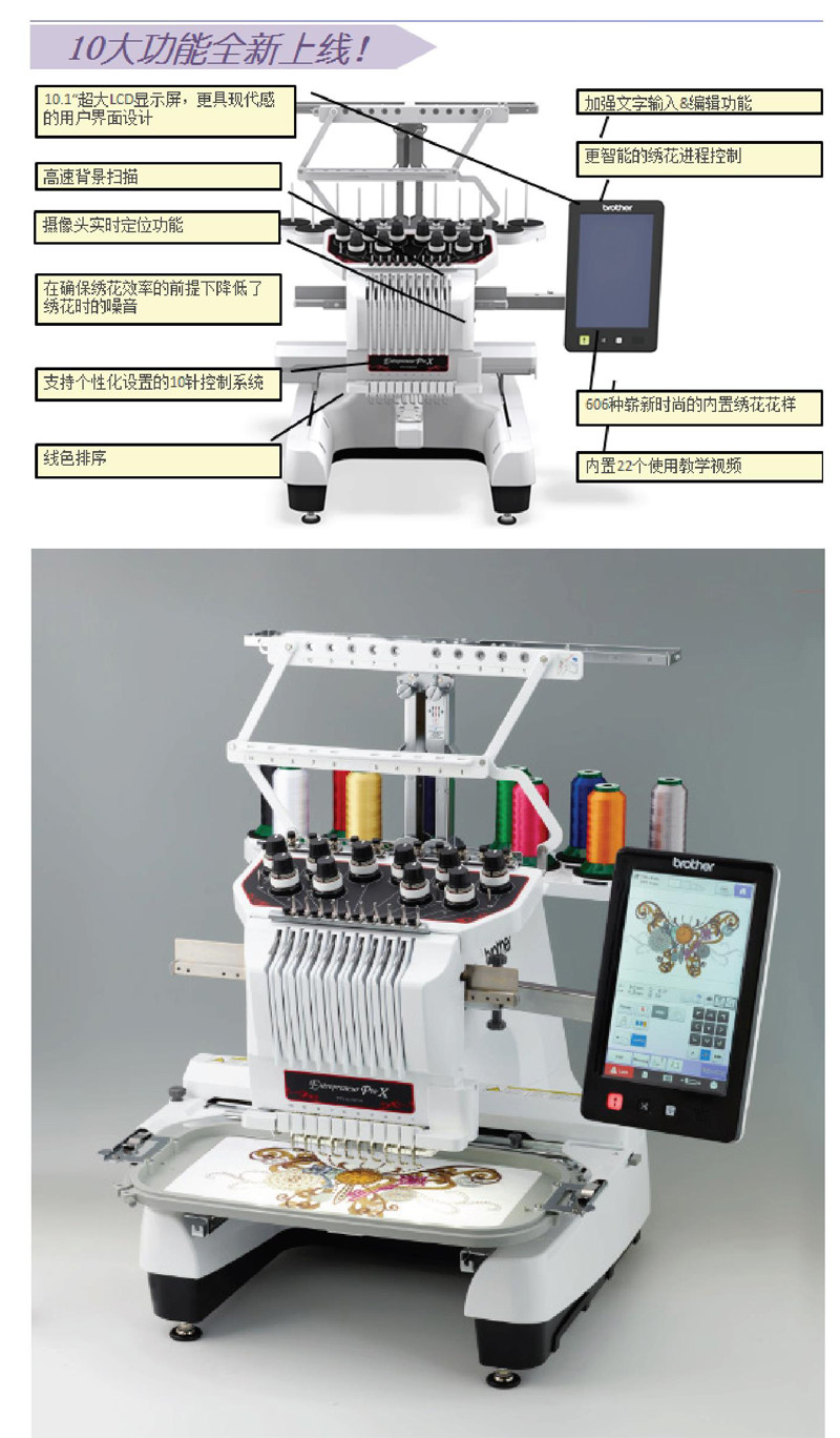 今年12月,兄弟(中国)商业有限公司在热销款商用绣花机PR1000e的基础上进行了进一步的改良,推出了全面升级的单头10针商用绣花机的II代进阶版机型——PR1050X,增加了多种实用功能。 此次经升级后全新面世的PR1050X在PR1000e的基础上进行了改良,主要新增及改良了十大功能: 1. 智能显示屏升级:彩色触摸显示屏升级至10.1”,在提供了更大更清晰的画面的同时,还实现了在屏幕上滑