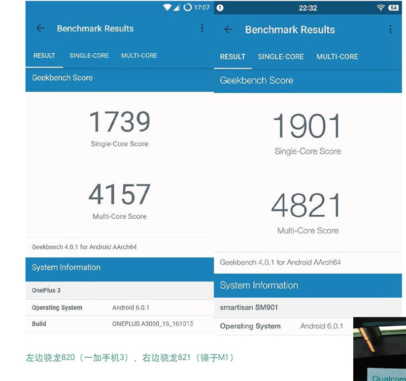 按照惯性思维,很多用户一直简单的认为骁龙821就是骁龙820的超频版,可是事实真的如此吗?让我们一起从目前官方给出数据深入探讨一番。 高通在2016年9月份的时候就向媒体和消费者们展示了目前消费级别最强处理器骁龙821,随后的两个月里,谷歌Pixel手机、锤子手机、小米手机都纷纷为用户们带来了搭载目前安卓阵营中最强处理器--高通骁龙821--的手机新品,按照惯性思维,以之前高通骁龙800到骁龙8