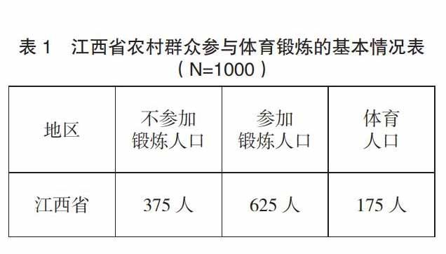 1 研究对象 随机抽取江西省9个市级地区;南昌市、赣州市、九江市、新余市、上饶市、萍乡市、抚州市、景德镇、鹰潭等地的农村作为研究对象。 2 结果与分析 2.1 江西省政府对农村体育的重视程度 对江西省农村各乡镇进行调查发现:江西省各地有关农村体育工作的文件以及制度建设并不完善,规章制度建设相当薄弱,加上领导对农村体育工作不够重视,因此大大影响农民对体育工作的认识和参与。由于江西省农村地区地