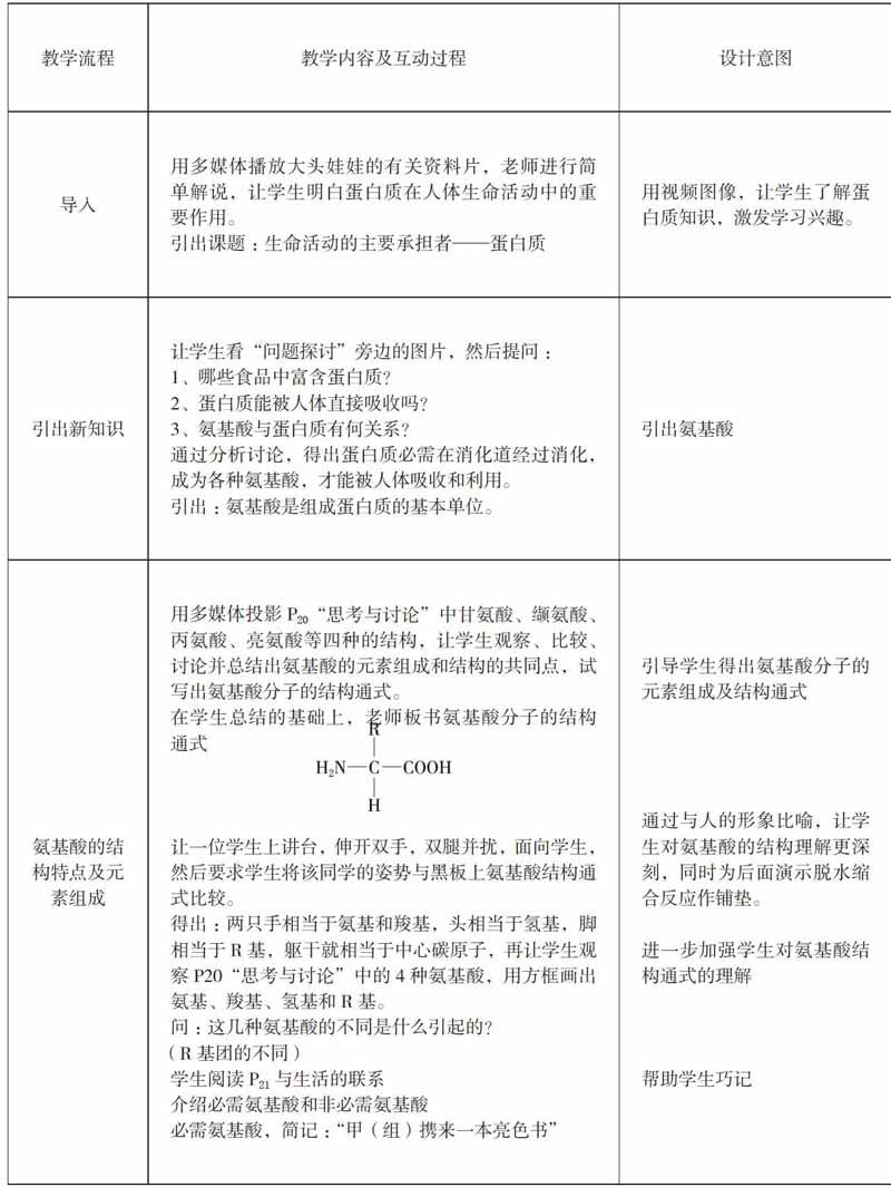 1 学习内容分析 本节内容是高中生物《必修一》第二章第2节内容,侧重让学生了解蛋白质的组成、结构和功能的多样性,及其能够成为生命活动的主要承担者的原因。20种氨基酸虽然结够不同,但是有共同的结构特征。课本没有直接给出氨基酸的结构通式,而是让学生观察4种氨基酸的结构,通过思考与讨论,找出氨基酸结构的共同特点,加深对氨基酸结构的理解。本节内容在教材中起到承上启下的作用。蛋白质种类繁多,功能多样,是生