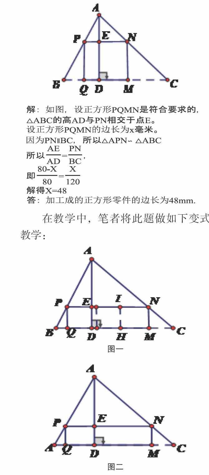 数学教材中例题、习题是数学问题的精华,挖掘其内在的学习线索,对这些题目进行推广与变式教学,能积极培养学生的创造性思维,达成多维目标的过程。现举数学课本中一道习题为例来谈谈变式教学。 如下图,△ABC是一块锐角三角形余料,边BC=120mm,高AD=80mm,要把它加工成正方形零件,使正方形一边在BC上,其余两个顶点分别在AB、AC上,这个正方形零件的边长是多少? 在教学中,笔者将此题做如下变式