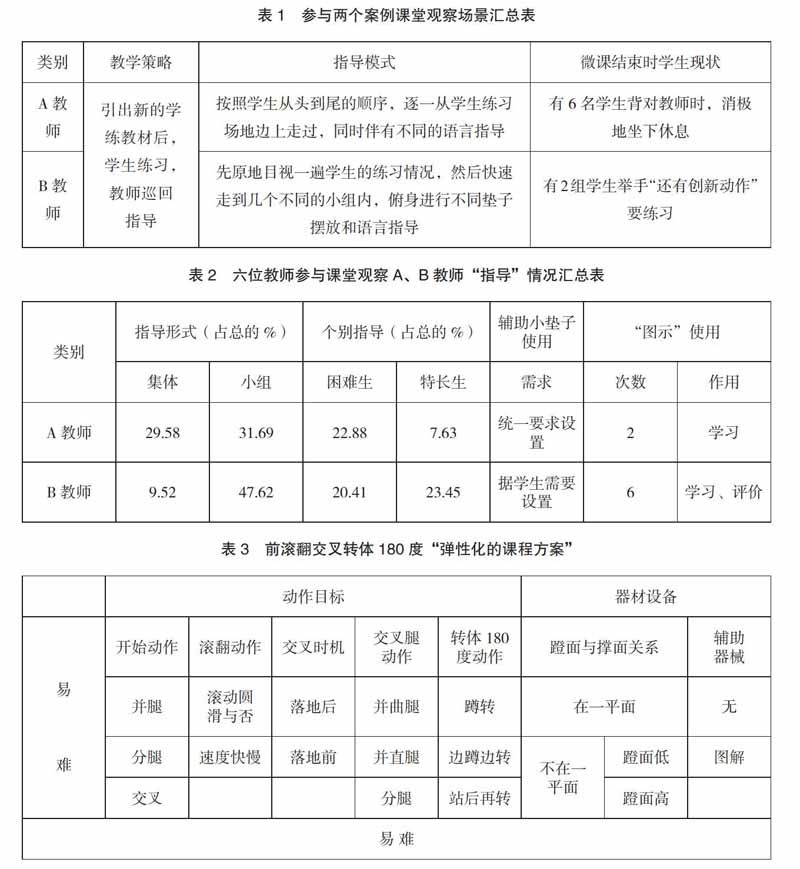 新课程倡导“以学生发展为本”、“面向全体”、“促进每一位学生发展”。课堂中的每一位学生都是独立的个体,受先天或后天的影响,存在这样或那样的差异这是客观事实。在以身体练习为主的体育课堂中,学生的差异更是显而易见。那么,教师具体怎么教才能既面向全体学生同时又兼顾个体差异,仍是现在教学中的一大难题。笔者将通过《前滚翻交叉转体180°》同课异构课的课堂观察案例来分析。 1 案例背景 同课异构的课程理念