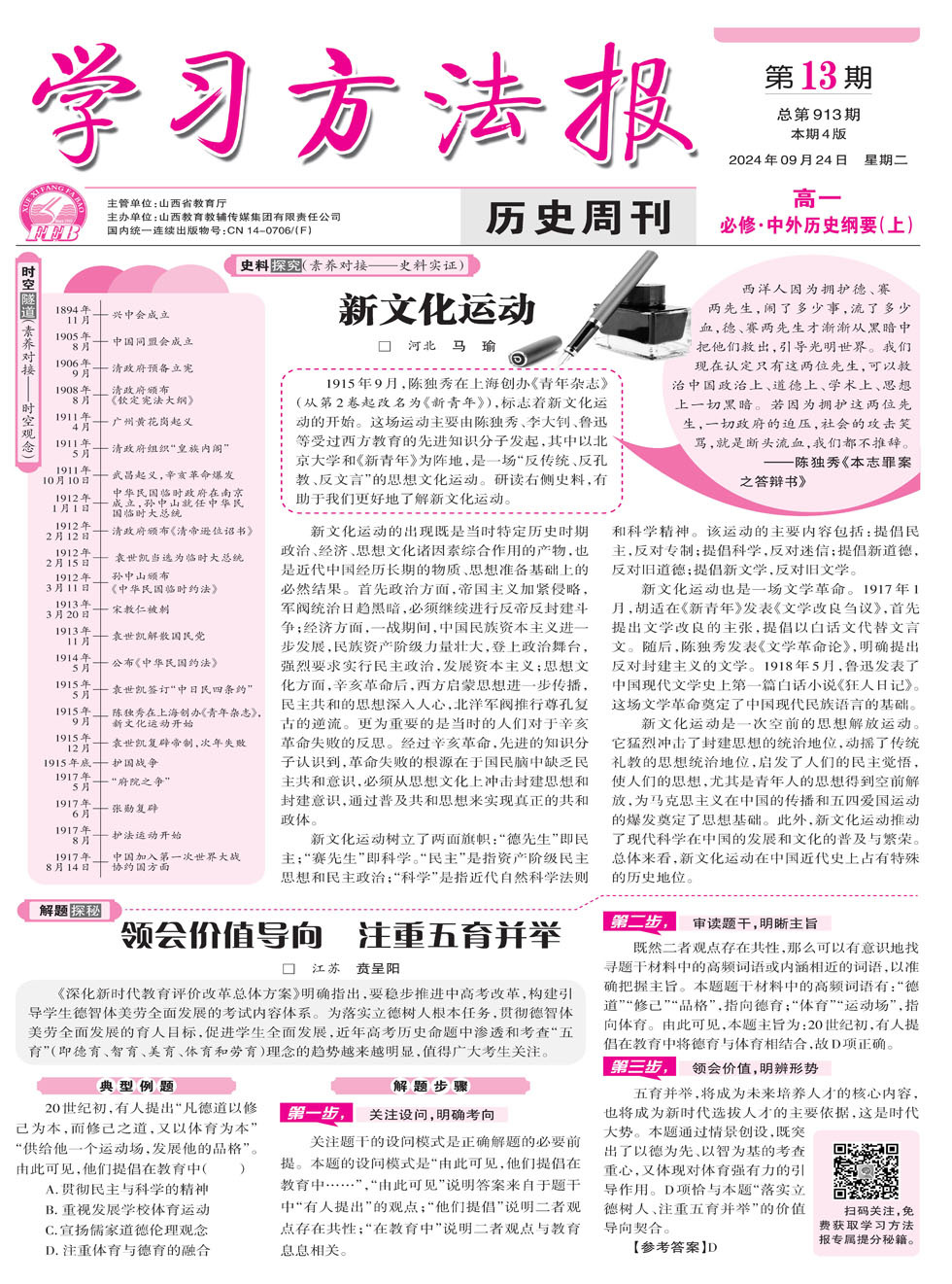 《深化新时代教育评价改革总体方案》明确指出,要稳步推进中高考改革,构建引导学生德智体美劳全面发展的考试内容体系。为落实立德树人根本任务,贯彻德智体美劳全面发展的育人目标,促进学生全面发展,近年高考历史命题中渗透和考查“五育”(即德育、智育、美育、体育和劳育)理念的趋势越来越明显,值得广大考生关注。 典型例题 20世纪初,有人提出“凡德道以修己为本,而修己之道,又以体育为本”“供给他一个运动场,