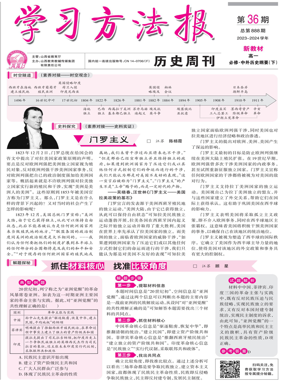 (素养对接——史料实证) 1823年12月2日,门罗总统在给国会的咨文中提出了对拉美国家政策原则的声明。要点是反对欧洲列强把美洲独立国家视为殖民对象,反对欧洲列强干涉美洲国家事务,反对欧洲列强把自已的政治制度强加给美洲国家等。概括起来就是不许欧洲列强对拉美独立国家实行新的殖民和干涉,实现“美洲是美洲人的美洲”。这些原则到1853年被美国官方称为门罗主义。那么,门罗主义是在什么样的背景下兴起的?又