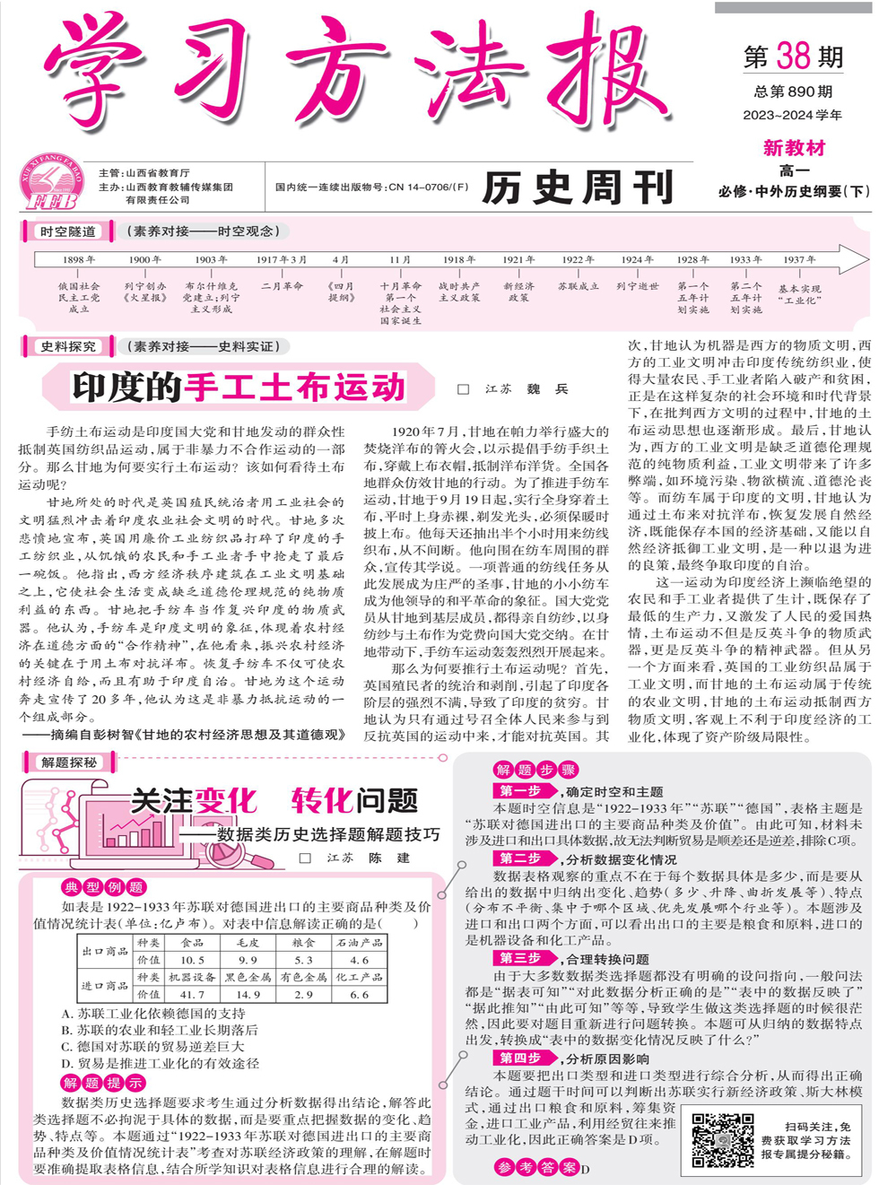 典型例题 如表是1922-1933年苏联对德国进出口的主要商品种类及价值情况统计表(单位:亿卢布)。对表中信息解读正确的是( ) A. 苏联工业化依赖德国的支持 B. 苏联的农业和轻工业长期落后 C. 德国对苏联的贸易逆差巨大 D. 贸易是推进工业化的有效途径 解题提示 数据类历史选择题要求考生通过分析数据得出结论,解答此类选择题不必拘泥于具体的数据,而是要重点把握数据的变化、趋势